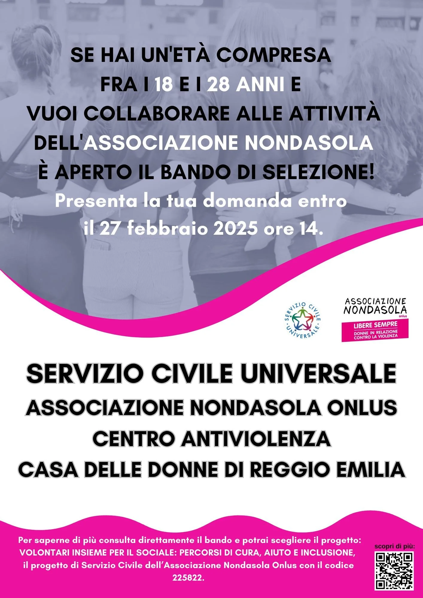 È online il bando per svolgere il tuo anno di Servizio Civile con l’Associazione Nondasola presso la Casa delle Donne di Reggio Emilia.