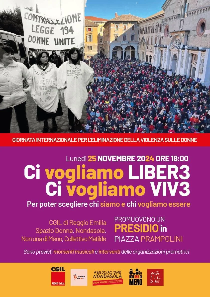 È una chiamata alla piazza e alla partecipazione, forte e chiara, quella che proviene da Cgil, Spazio Donna, Associazione Nondasola, Non una di meno e Collettivo Matilde per il prossimo lunedì 25 novembre. In occasione della Giornata internazionale per l’eliminazione della violenza contro le donne, sotto lo slogan “Ci vogliamo vivɜ, ci vogliamo liberɜ”, Reggio Emilia dà voce a tutte le donne e le persone che subiscono la violenza patriarcale. La voce di chi, in un contesto sociopolitico in cui si rafforzano spinte conservatrici e politiche liberticide, rivendica di poter scegliere e autodeterminarsi. L’appuntamento è per lunedì 25 novembre, dalle ore 18, in piazza Prampolini. Sono previsti momenti musicali e interventi delle organizzazioni promotrici.