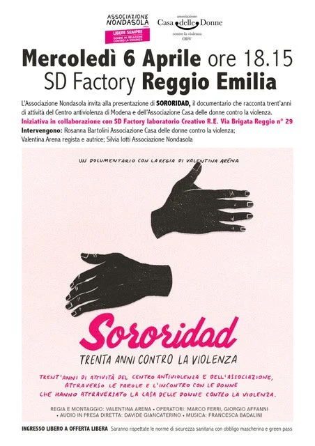 Mercoledì 6 aprille alle ore 18,15 si terrà presso SD Factory la presentazione del documentario “Sororidad” con la regia di Valentina Arena. Il documentario racconta i trent’anni di attività del Centro antiviolenza di Modena e dell'Associazione Casa delle donne contro la violenza.