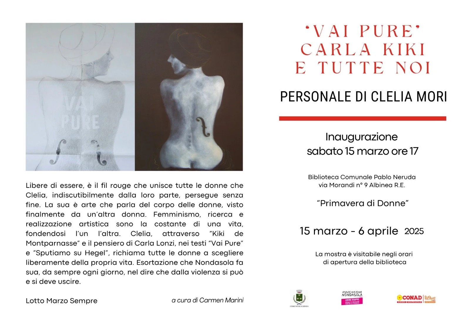 Volentieri vi segnaliamo l’inaugurazione della mostra "Vai Pure. Carla Kiki e tutte noi" con opere dell'artista Clelia Mori e curata da Carmen Marini (Associazione Nondasola), che si terrà il giorno sabato 15 marzo ore 17:00 presso Biblioteca Comunale Pablo Neruda, Via Morandi 9 Albinea (RE).
