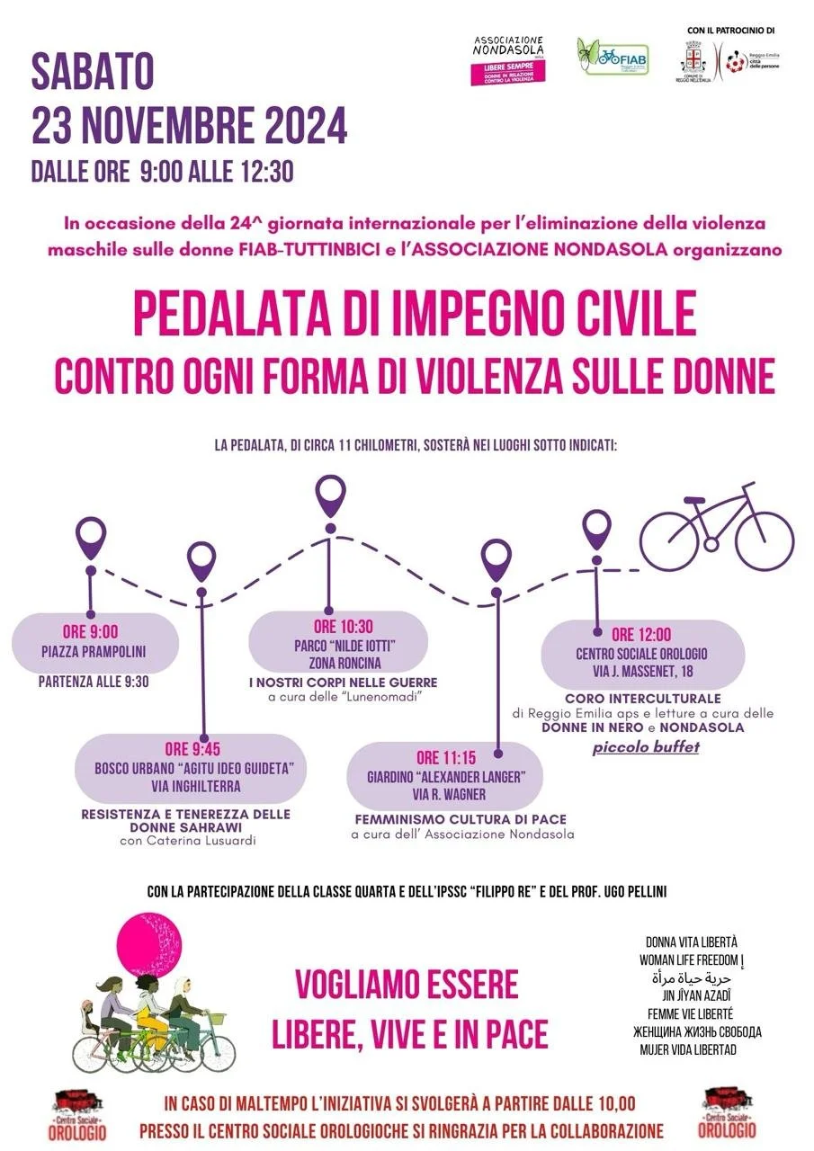Volentieri vi segnaliamo la Pedalata di impegno civile contro ogni forma di violenza sulle donne, promossa da Fiab-Tuttinbici e Associazione Nondasola, che si terrà il giorno sabato 23 novembre, a partire dalle ore 9 con ritrovo in piazza Prampolini.